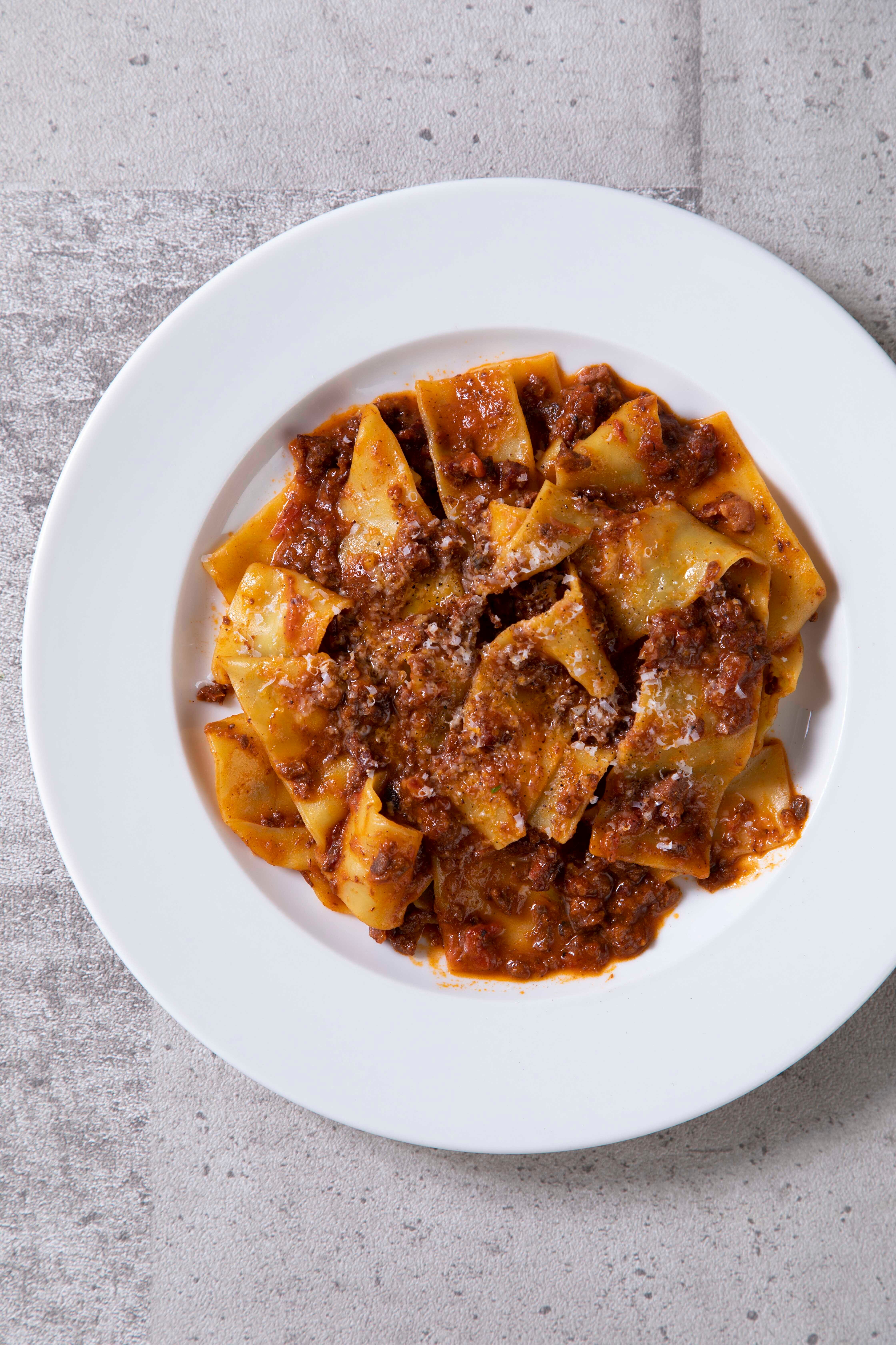 イタリア産生ハムやサラミ、黒毛和牛や豚肩ロースなど、様々な種類や部位を配合し、トマトでじっくり煮込んだオリジナルミートソース!! 口の中で広がる様々な触感や香りをお楽しみ下さい!!